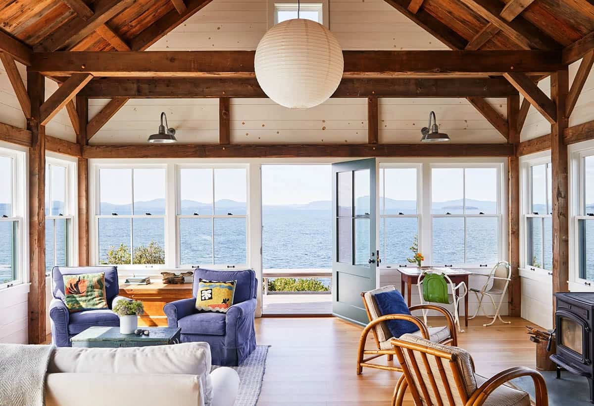 Above: The overhead light fixture is a Noguchi-style paper lantern. The wall sconces are from Barn Light Electric. The exposed oak beams were salvaged from an old barn in Montana. The structure was built off the island, brought over by barge, and constructed on site. The timber post-and-beam frame was built by Rockport Post & Beam.