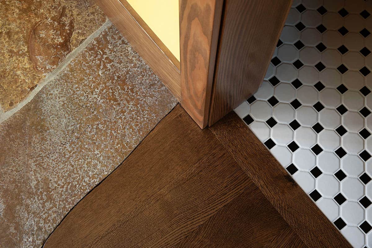 Above: Custom cabinetry in heart hickory, backsplash in Daltile Remedy – Alchemy RD25, countertops in granite Sedna Extra Gold. The floors are tiled with American Olean Kendal Slate – Carlisle Black KS03.