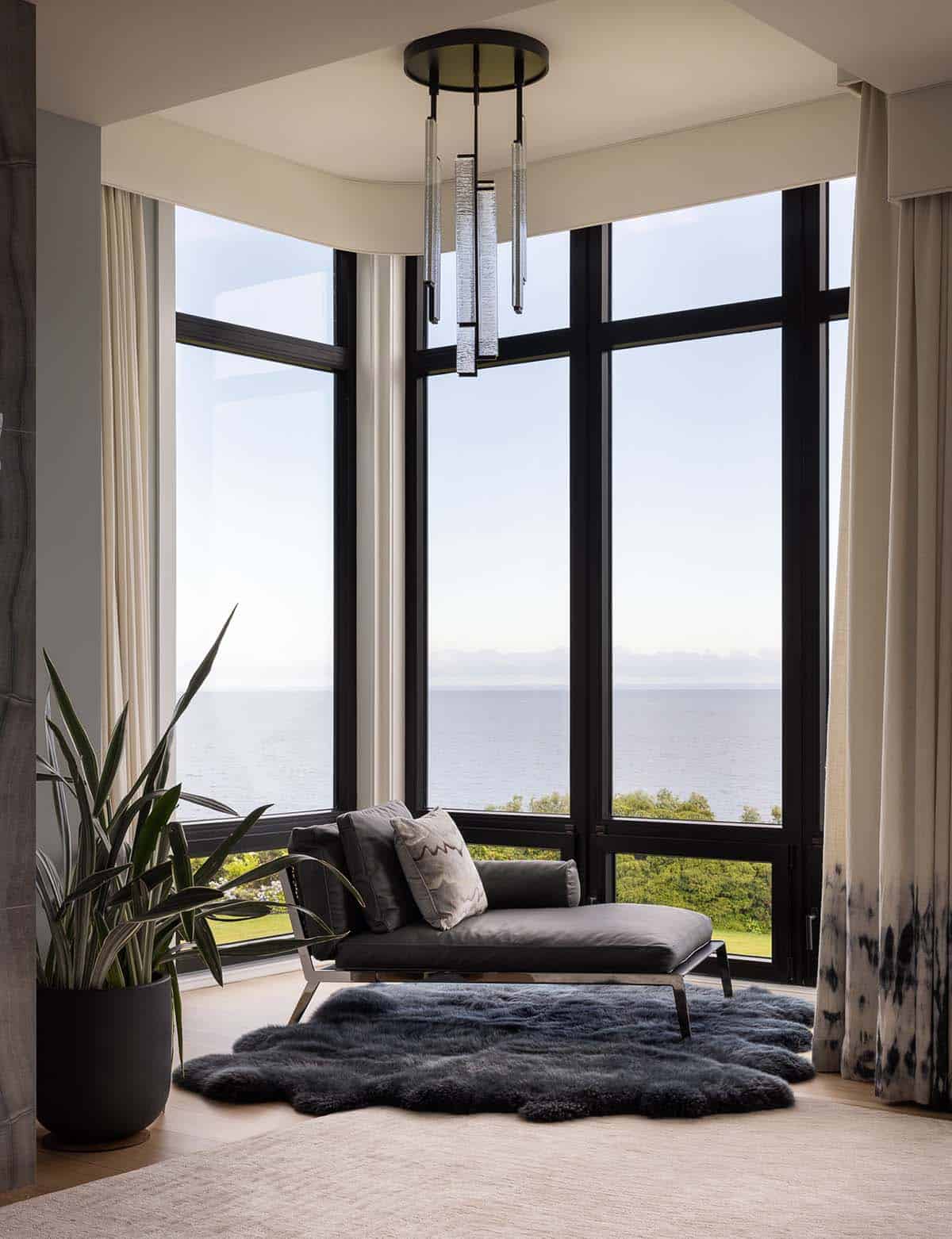 Expansive windows flood the interior with light, enhancing the connection to the outdoors while custom furnishings, such as the tailored bar in the club room, invite both relaxation and social interaction. Decorative accents, like curated art pieces and organic textiles, further unify the space, creating a serene atmosphere that balances sophistication with comfort.