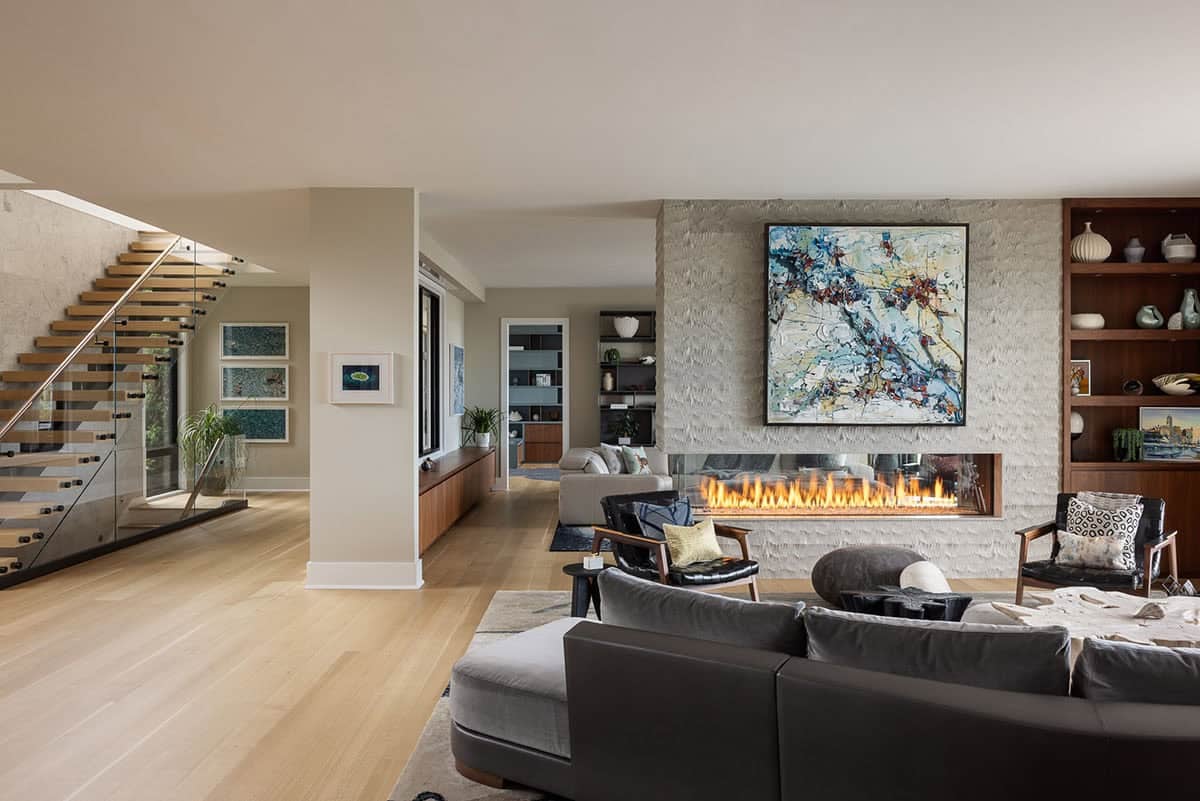 Making way through the foyer, guests are greeted by an open floor plan that moves uninterrupted into the expansive living spaces, maximizing natural light and the stunning views outside. The use of biophilic design principles, incorporating natural materials like textured stone and warm wood finishes, add a touch of intimacy and warmth.