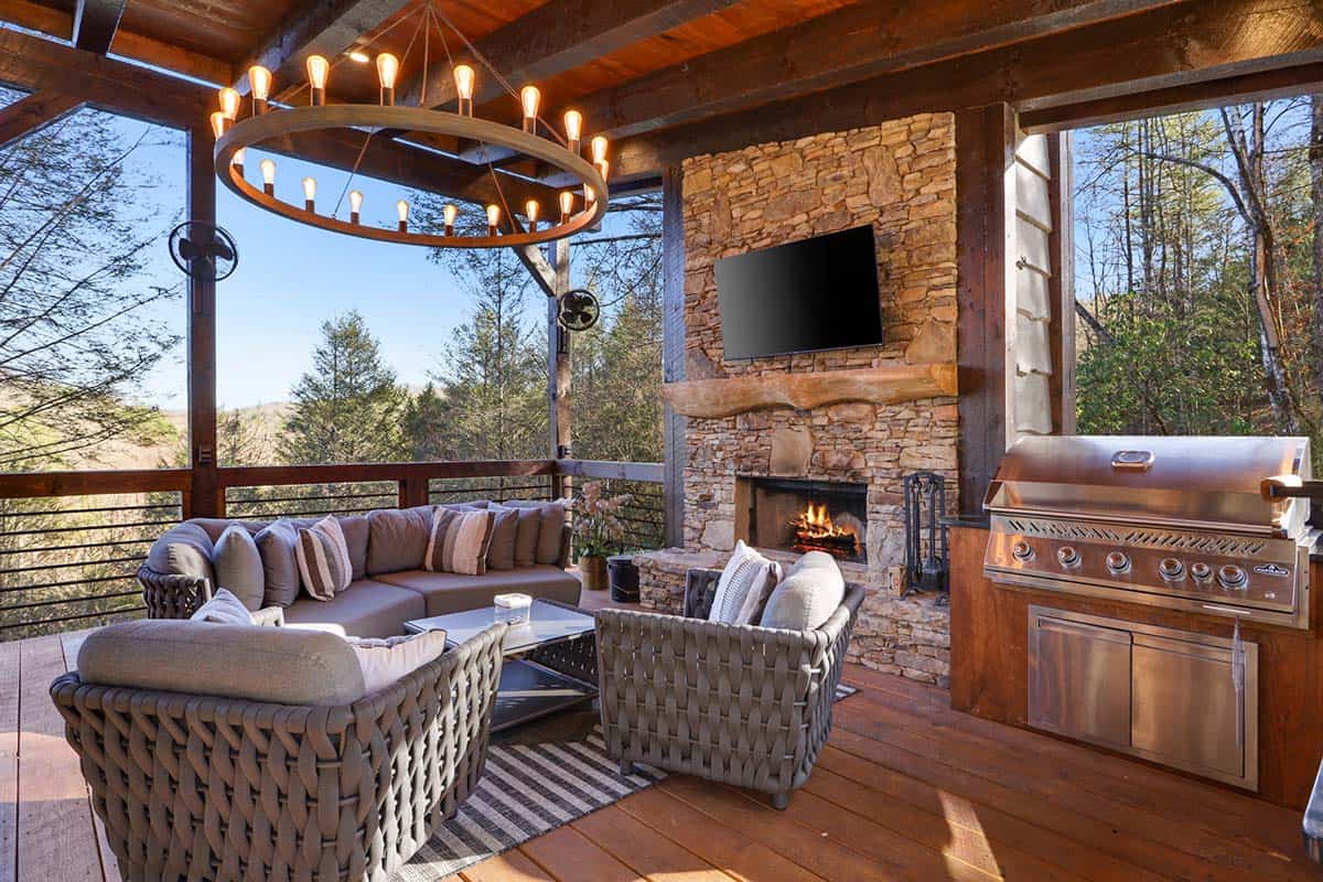 Nestled in a private river community in the Blue Ridge Mountains, Georgia, this home offers idyllic views and luxurious details throughout. Multi-level porches provide the ultimate in entertainment, with spaces for lounging, cooking, and dining. There is also a 10-person hot tub.