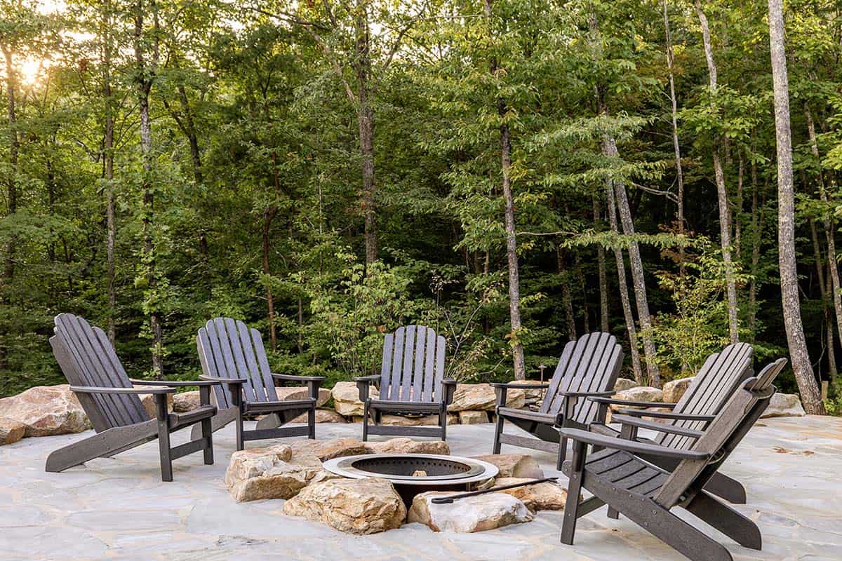 Above: The home on Blackberry Mountain offers a vacation-like backyard oasis with lounging spots and a sumptuous swimming pool.