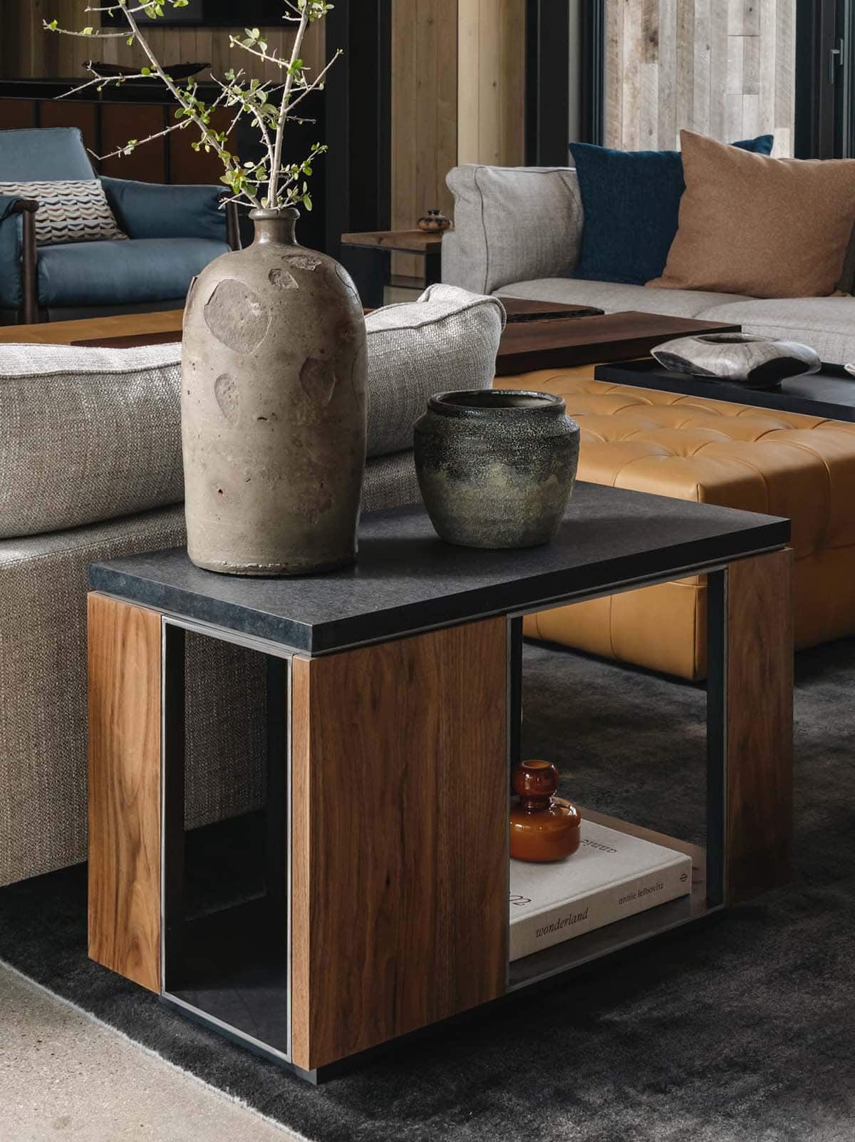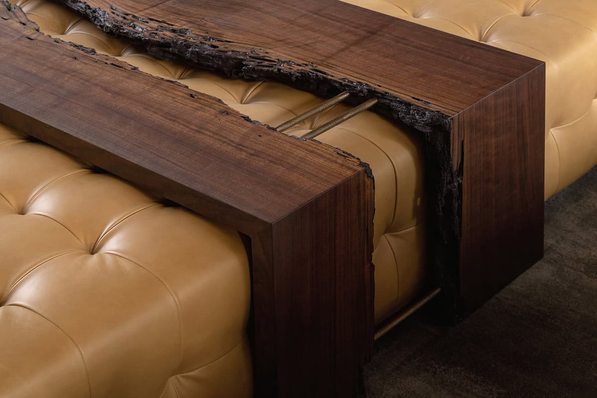 Above: This custom table brings the warmth of natural wood into everyday living. Designed with the same materials and textures that shape the home itself, the piece rests at the heart of a cozy chaise. This piece was custom-crafted by Domi Goods.