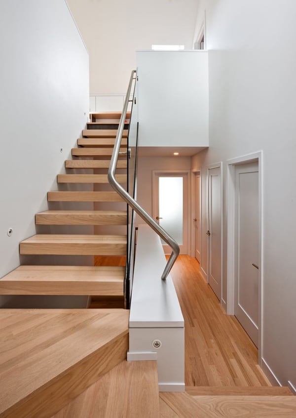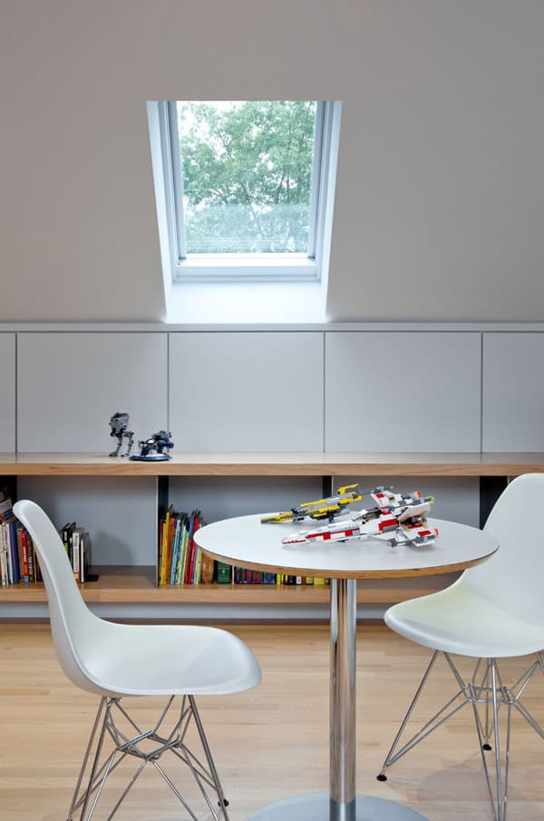 The interior is similarly direct. The first level of the home becomes a single, white, open volume with a dark mass of service spaces placed off-center. This mass subtly defines the first level living spaces. The second level houses the bedrooms while the attic becomes a playroom space, flanked by additional bedrooms. Throughout, efforts were made to create a cohesive whole with a sense of openness out of the cellular rooms of the existing home.